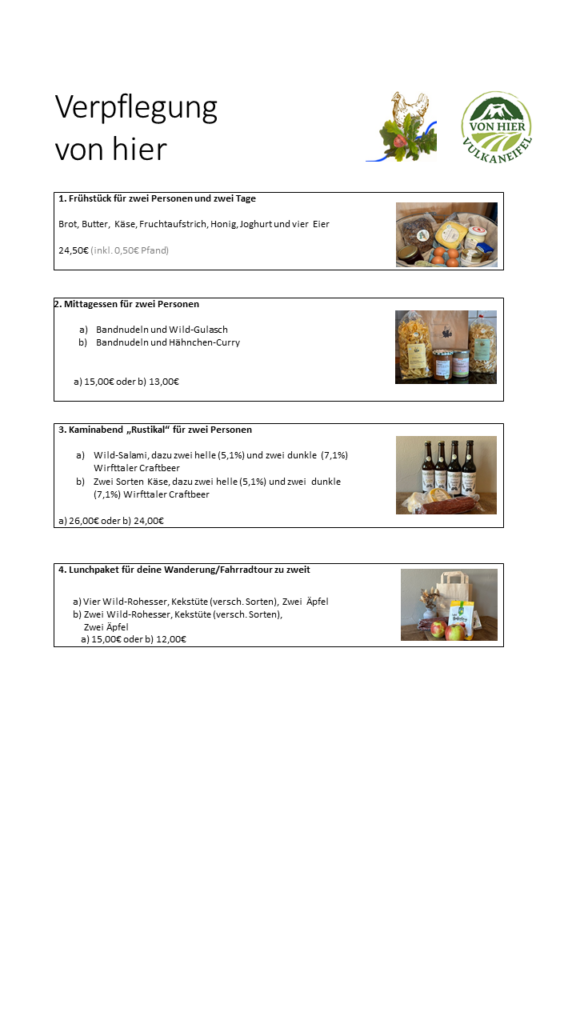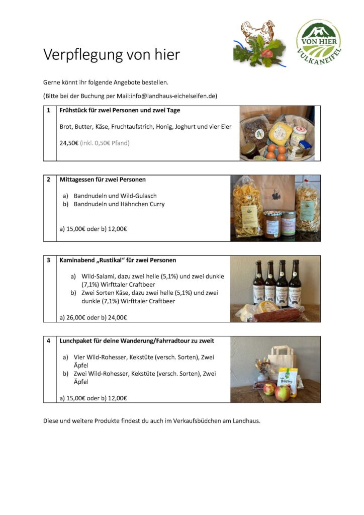Frische Eier und mehr (Gebäck,Snacks,Wildsalami, Rohesser, Ziegenkäse, Vegane Brotaufstriche, Getränke etc) täglich am gegenüberliegenden Eierhäuschen/Hofladen Öffnungszeiten 07:00 – 21:00 Uhr . Alkoholische Getränke aus der Region gibt es u.a auch gekühlt auf Nachfrage, eine Wein auswahl für den Abend rundet das ganze ab. (Entsprechende Gläßer können unentgeltlich ausgeliehen werden)